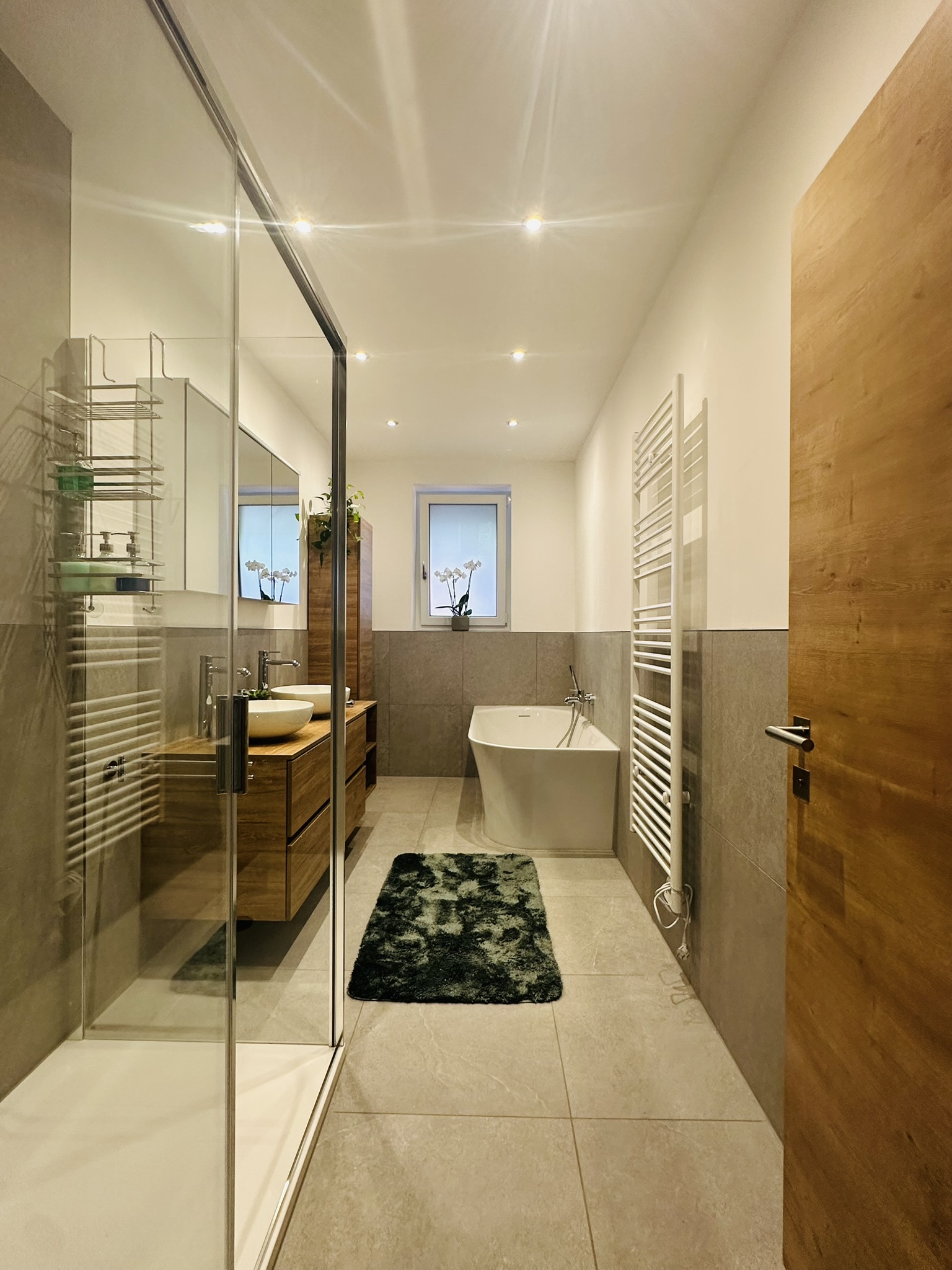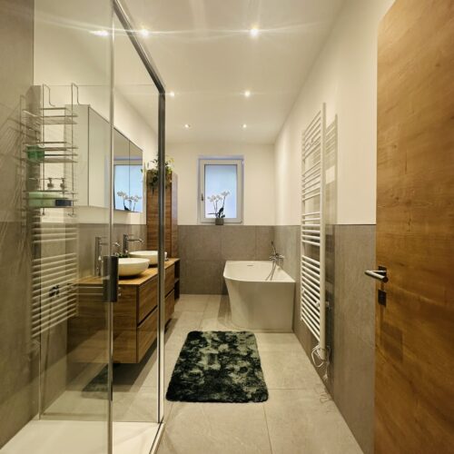 Ein besonderes Augenmerk liegt auf der neuen Dusche mit barrierefreiem Eingang sowie der dazu passenden Steinoptikfliesen und einer geräumigen Badewanne zur absoluten Entspannung. Ein stilvoller Waschtisch in Holzverarbeitung mit großzügigem Stauraum runden das harmonische Gesamtbild ab.