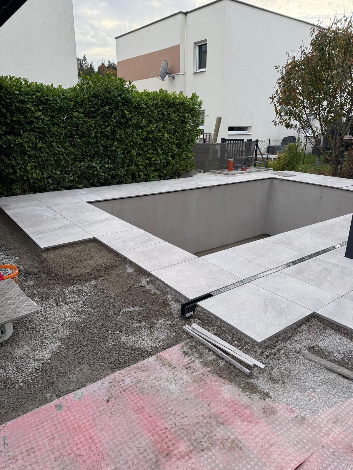 Für dieses private Wohnhaus von Familie H. in Linz durften wir die komplette Poolumrandung sowie die angrenzende Terrasse mit hochwertigen Feinsteinzeugfliesen gestalten. Das Ziel: Eine harmonische Verbindung von Ästhetik, Funktionalität und Langlebigkeit – perfekt abgestimmt auf die moderne Architektur des Hauses.