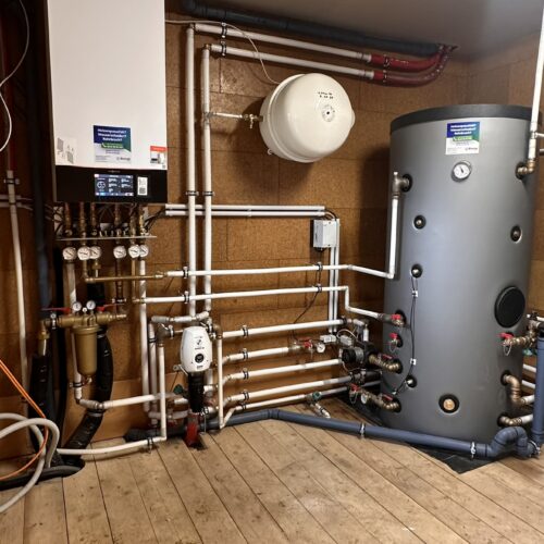 Die Sanitär- und Heizungsinstallation eines Einfamilienhauses, das sensibel und harmonisch in einen bestehenden Hof integriert wurde.