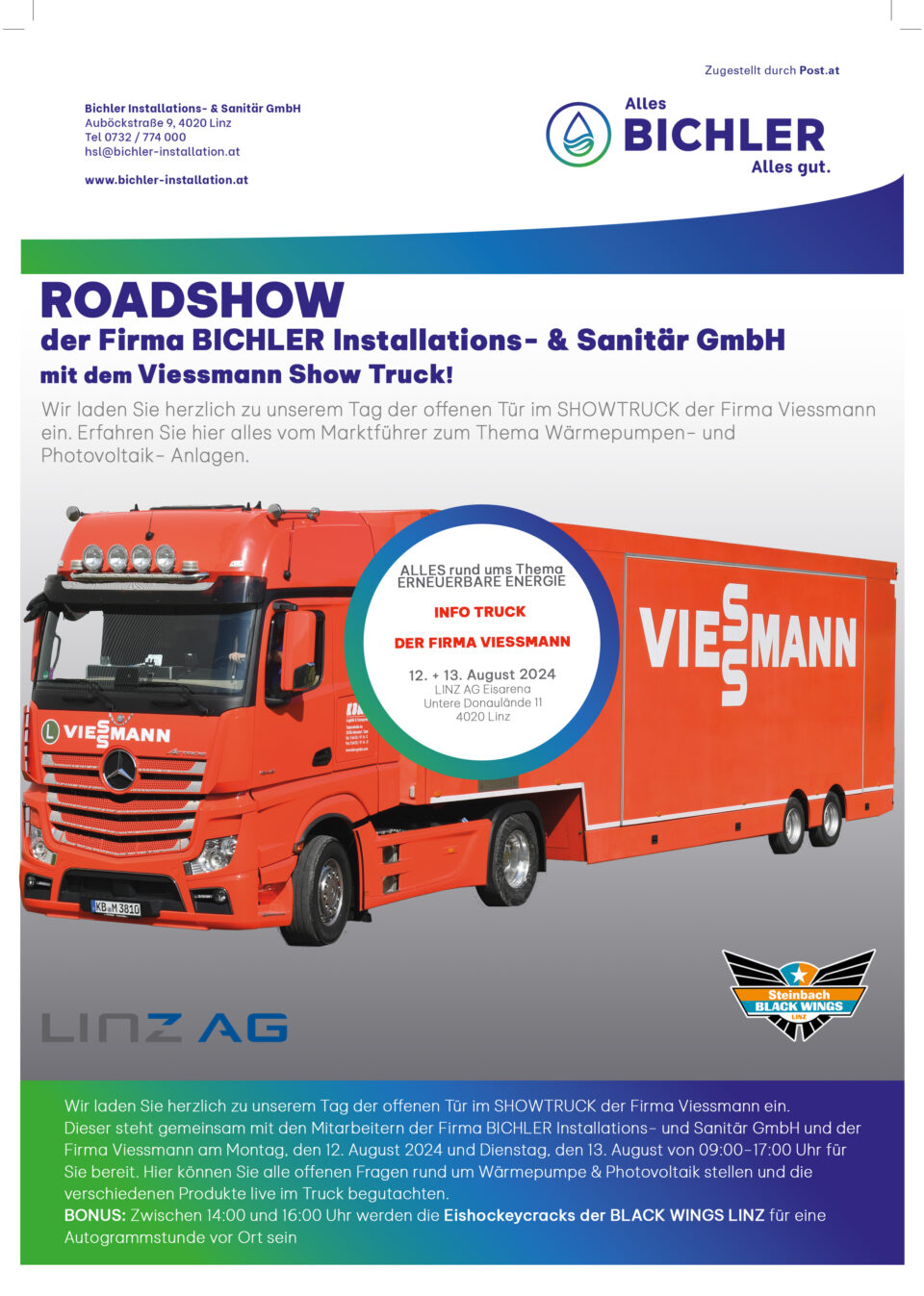 Wir laden Sie herzlich zu unserem Tag der offenen Tür im SHOWTRUCK der Firma Viessmann ein. Dieser steht gemeinsam mit den Mitarbeitern der Firma BICHLER Installations- und Sanitär GmbH und der Firma Viessmann am